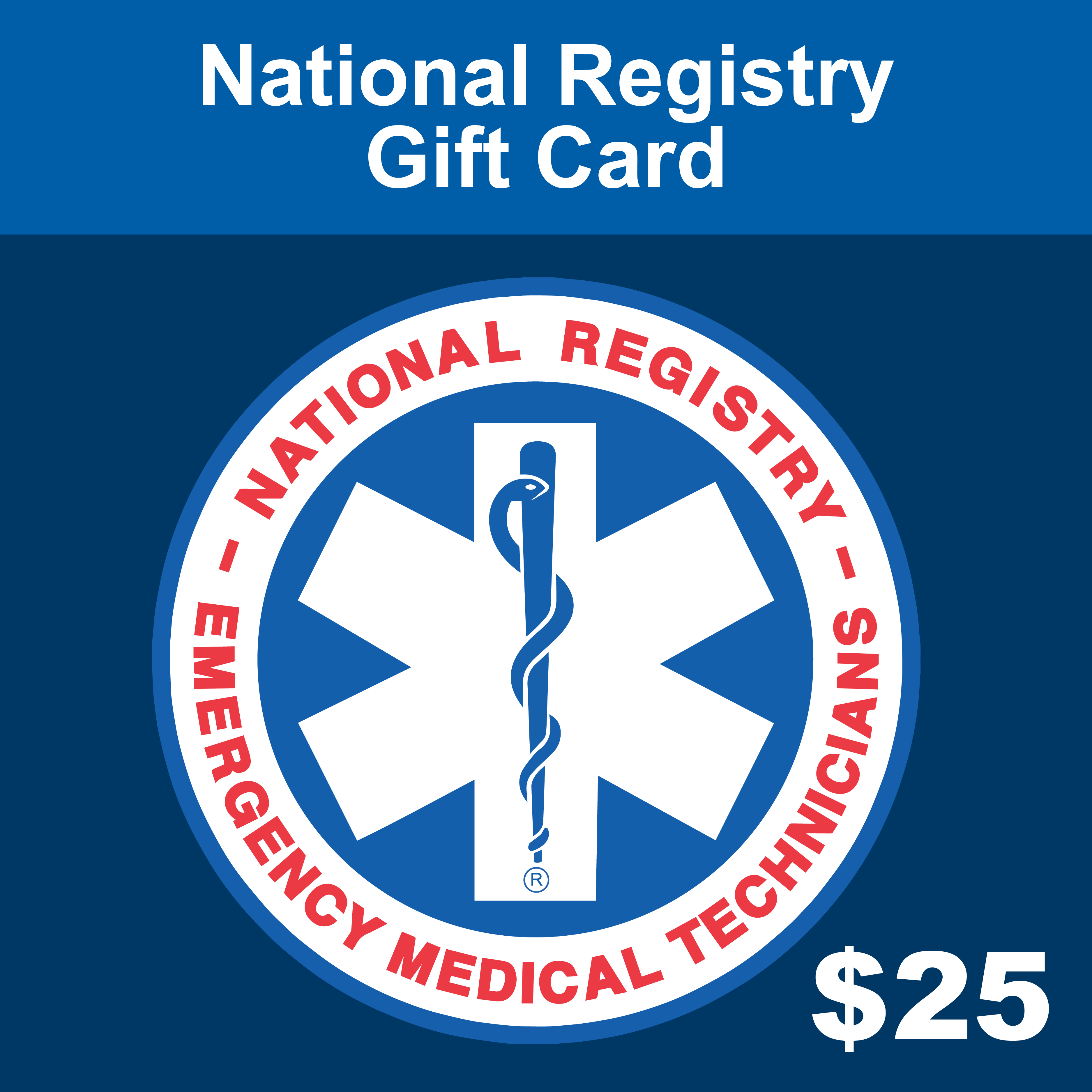 The National Registry store offers gift cards in a variety of amounts that are available to purchase by EMS professionals, family, and friends. National Registry gift card are redeemable for most items within the National Registry store. If you are looking to support an EMS professional or candidate by sponsoring their upcoming certification exam, please visit our Vouchers page.