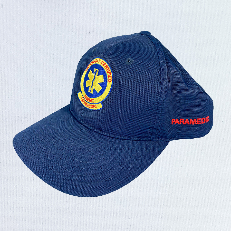 This blue adjustable quick-drying cap has a cooling sweatband and performs with moisture wicking technology. The cap features the National Registry’s Paramedic patch embroidered on the front and Paramedic embroidered in a contrasting color on the side. The fabric is 91% nylon with 9% cotton twill. The hook and loop adjustable band will ensure a perfect fit.